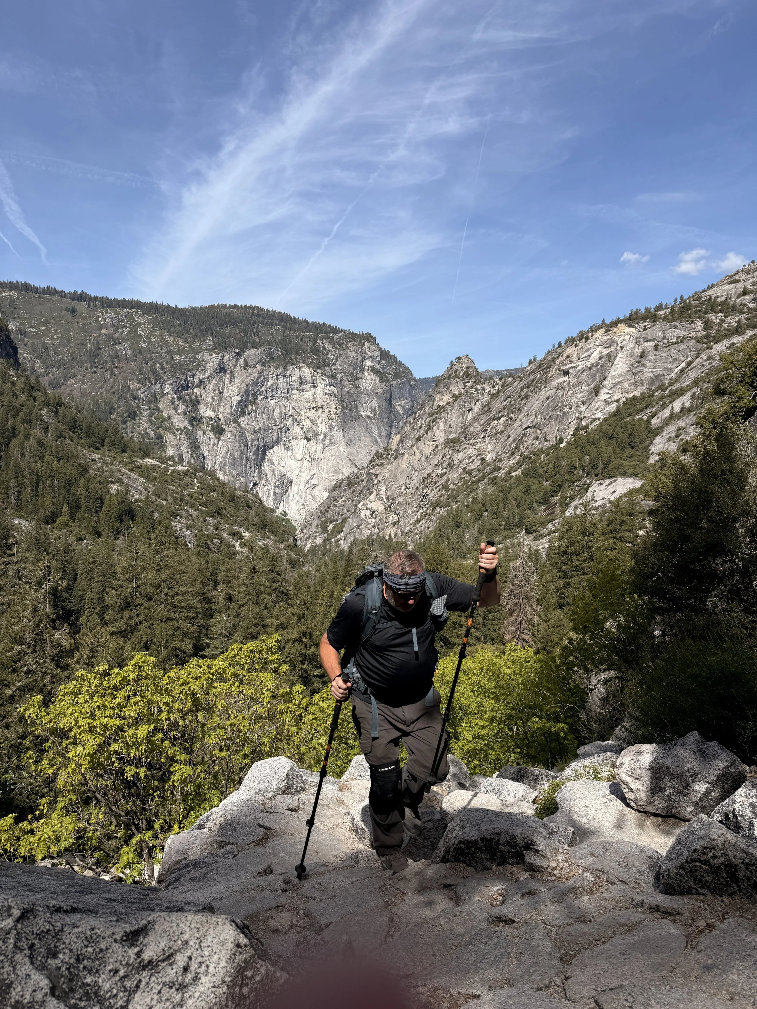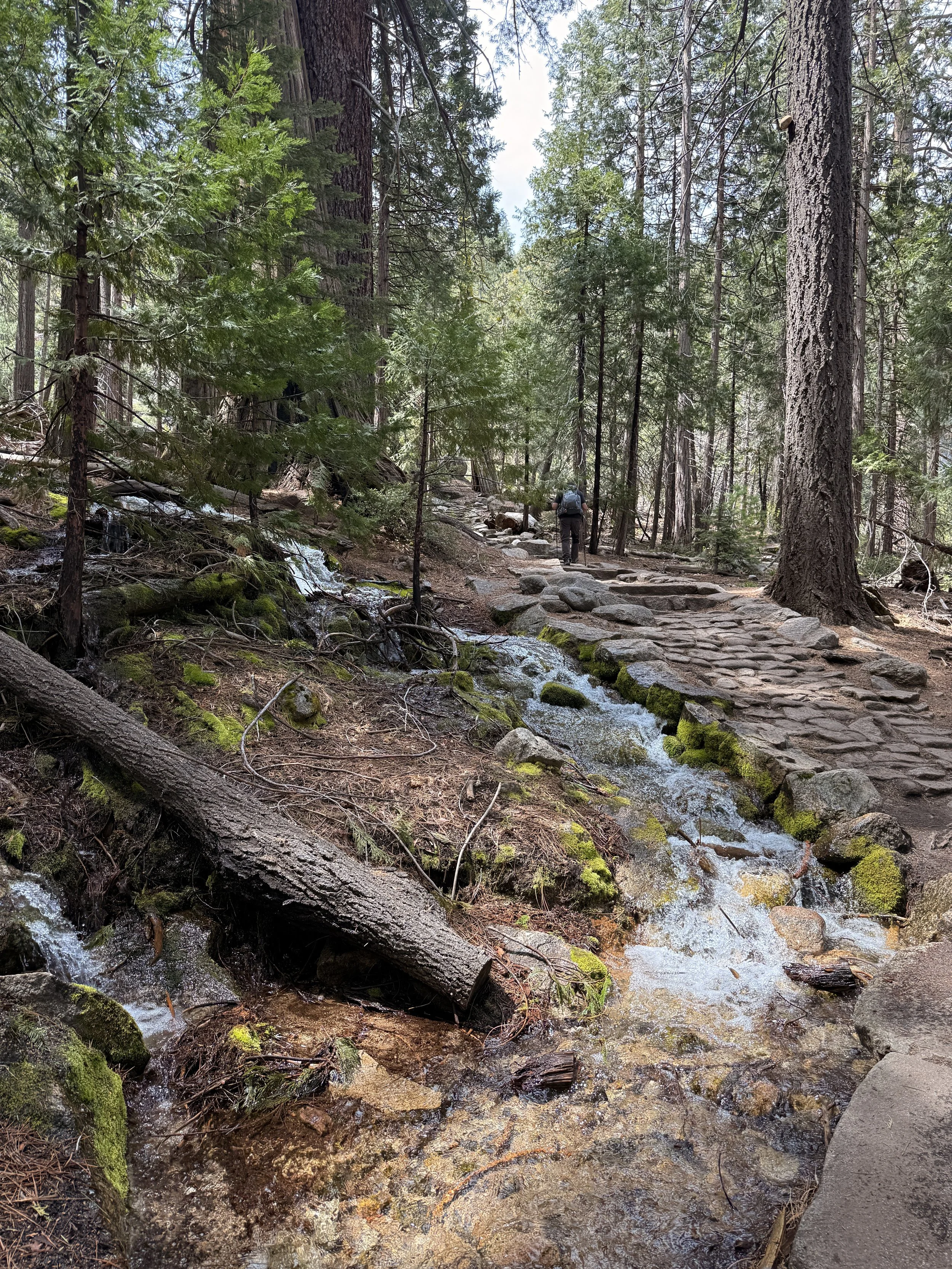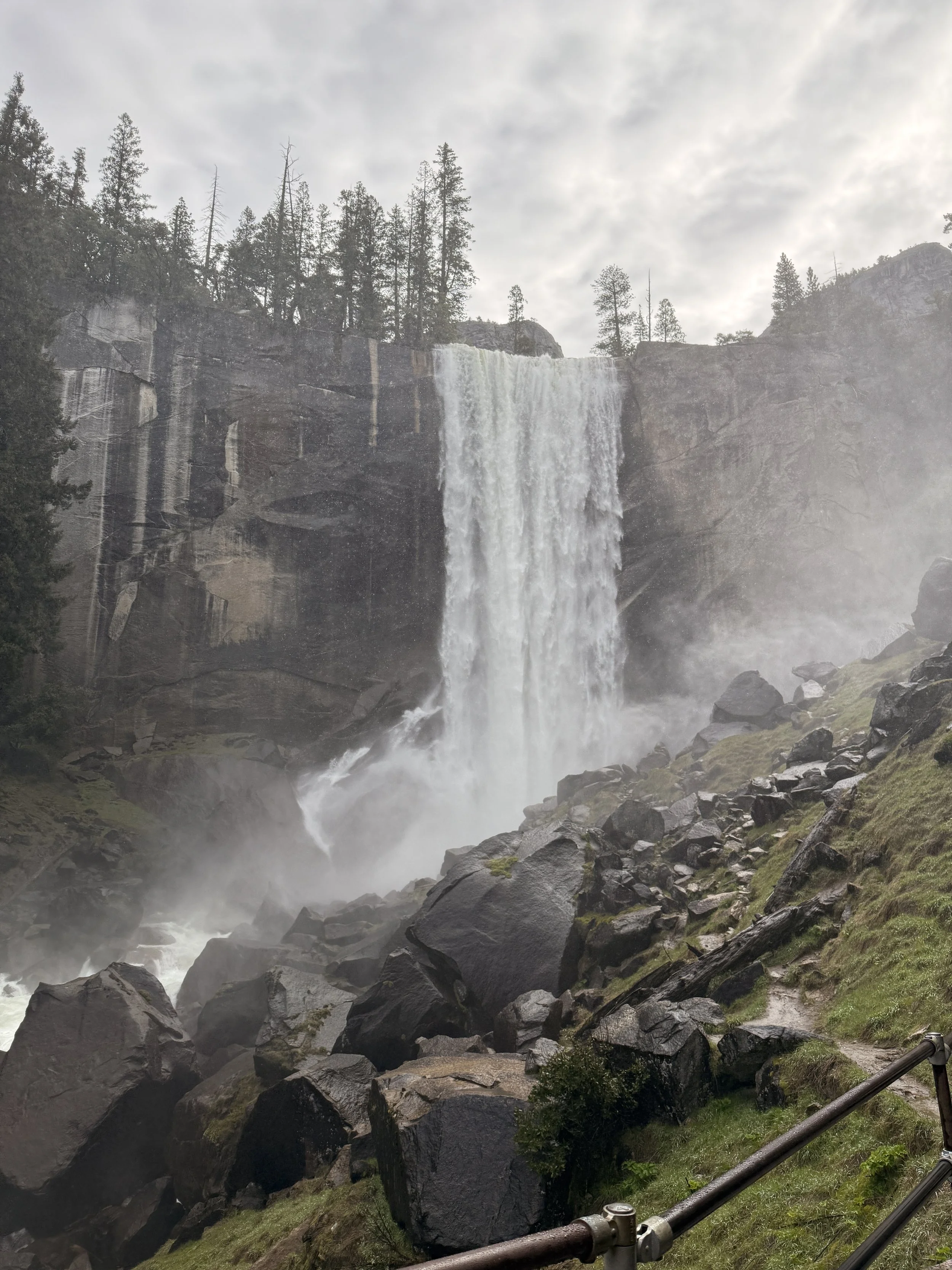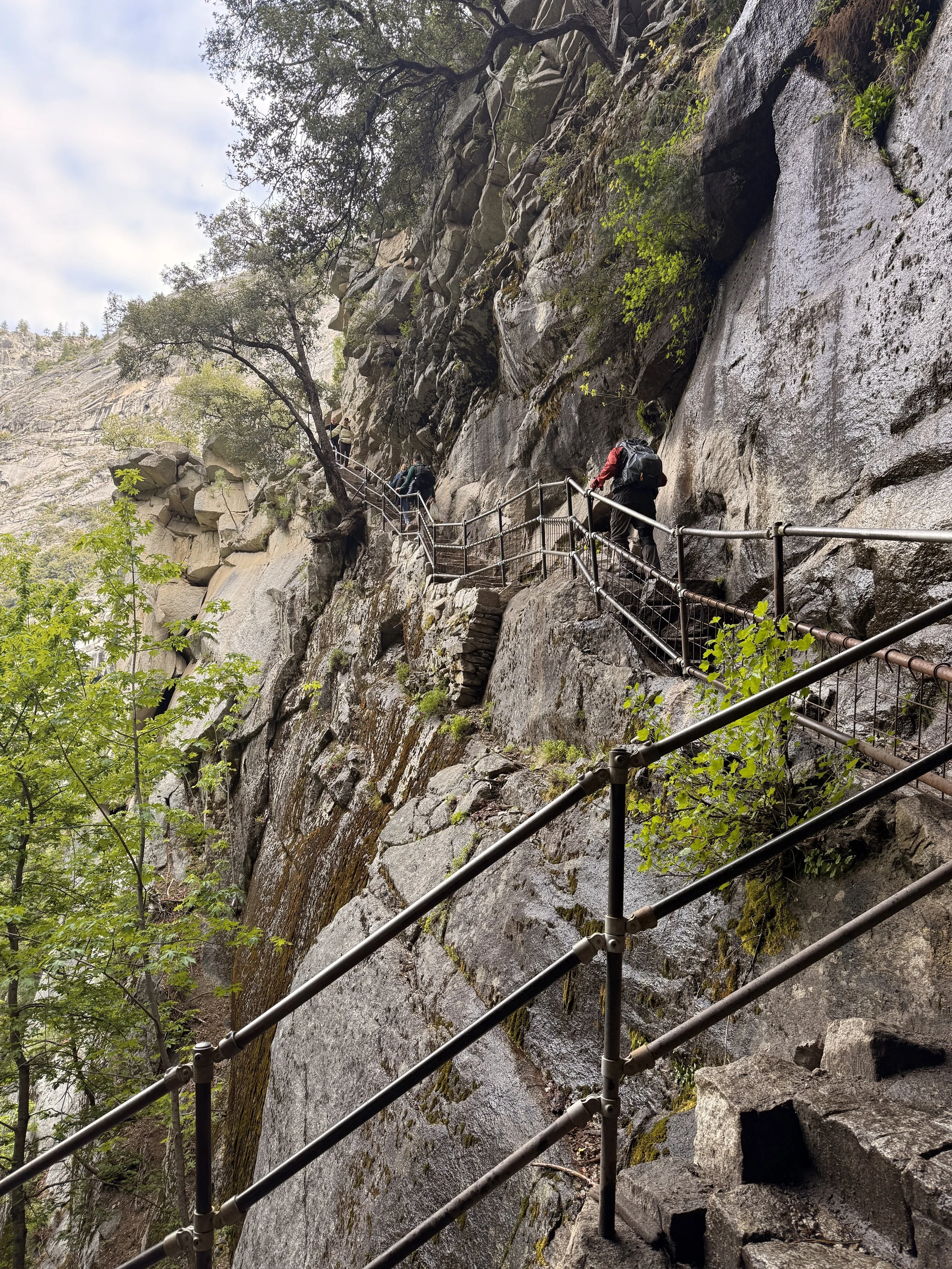This part of the hike was a lot less scary than the way up but it was still quite challenging. Almost immediately you come to a part called “the cliff” where you walk a part of the path that has some overhang from the cliff above and because all the snow was melting, this turns into quite the shower scenario. So after donning our rain jackets again we ploughed through. From there back down to where the path meets the Vernal Falls trail again was a constant descent of switchbacks. Trekking poles are extremely useful in this scenario if you don’t want sore knees. The path also turns into loose gravel at time and we saw a few people (who were wearing sneakers) nearly take a tumble.