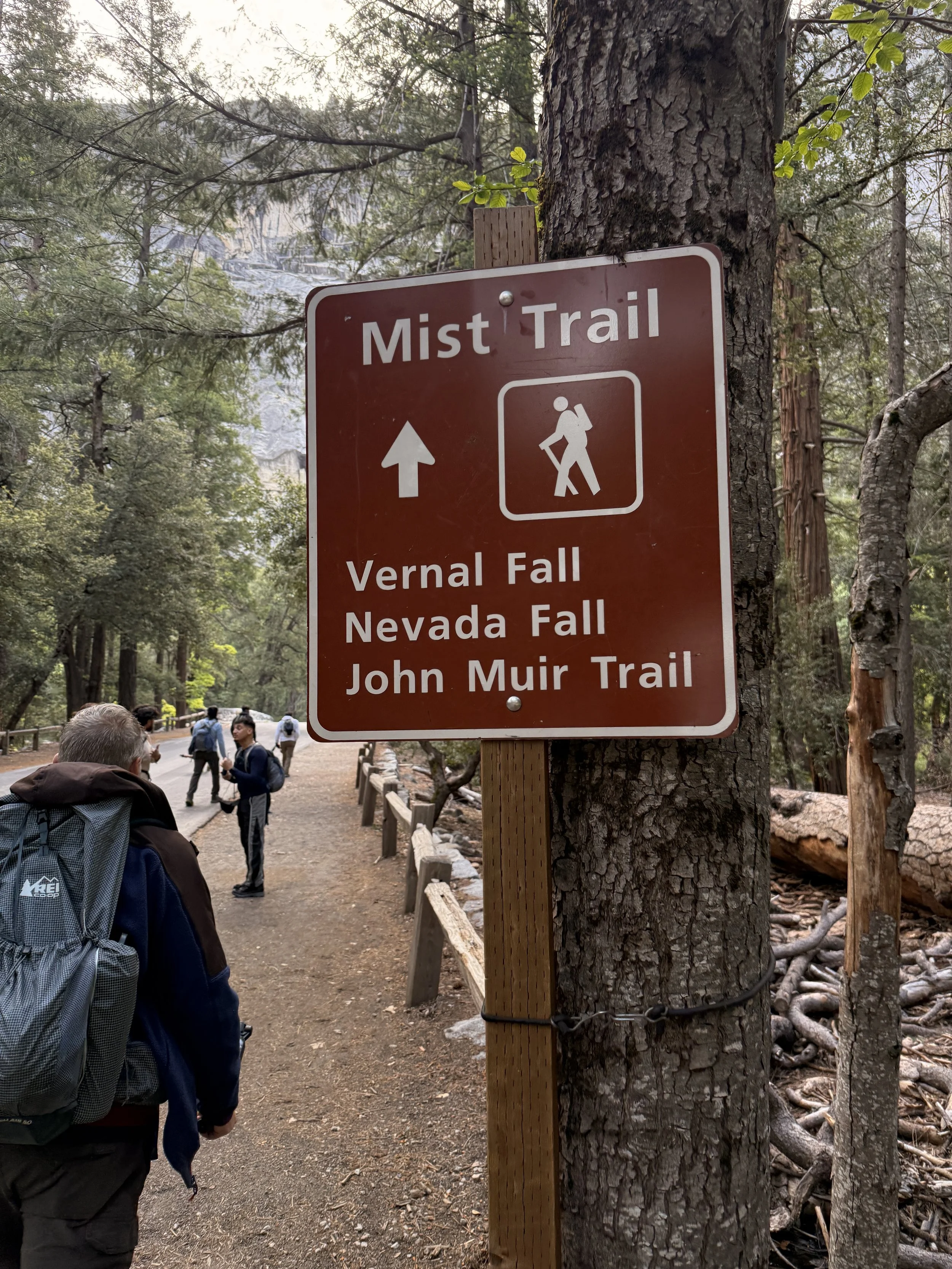 We woke up early again and drove into Curry Village to park for the mist trail. We actually ended up parking in the wrong place but thankfully we did manage to snag a spot. The parking for Vernal Falls/Nevada Falls/The Mist Trail is actually about 0.8 miles away from the trail head. There is a shuttle that can take you from the parking lot but it’s also flat road the whole way if you want to walk. The shuttle doesn’t start running until 7am so we had to walk. Once you get to the trailhead you get to walk along the river for about a quarter of a mile before your uphill slog begins. And what a slog it is.