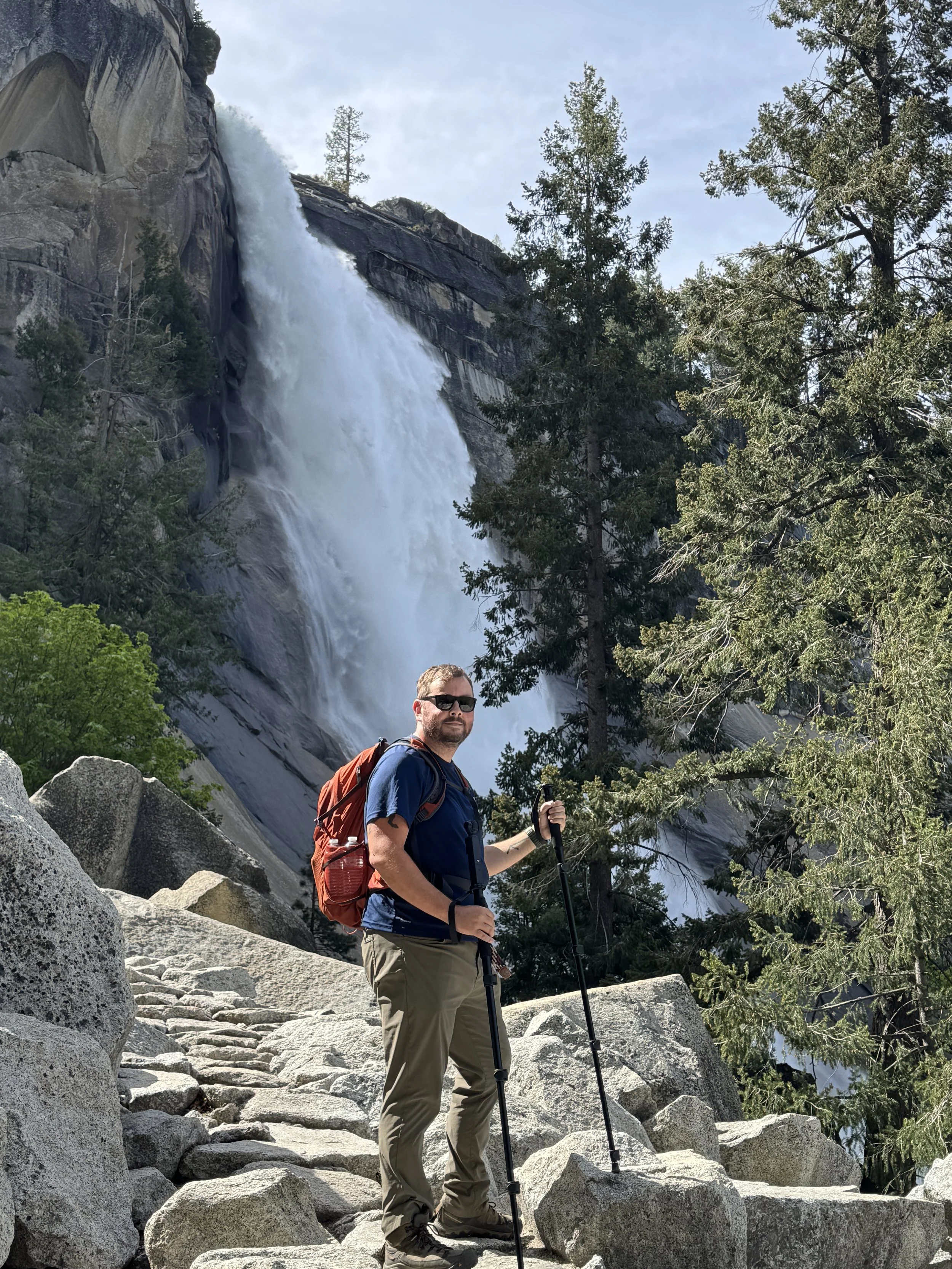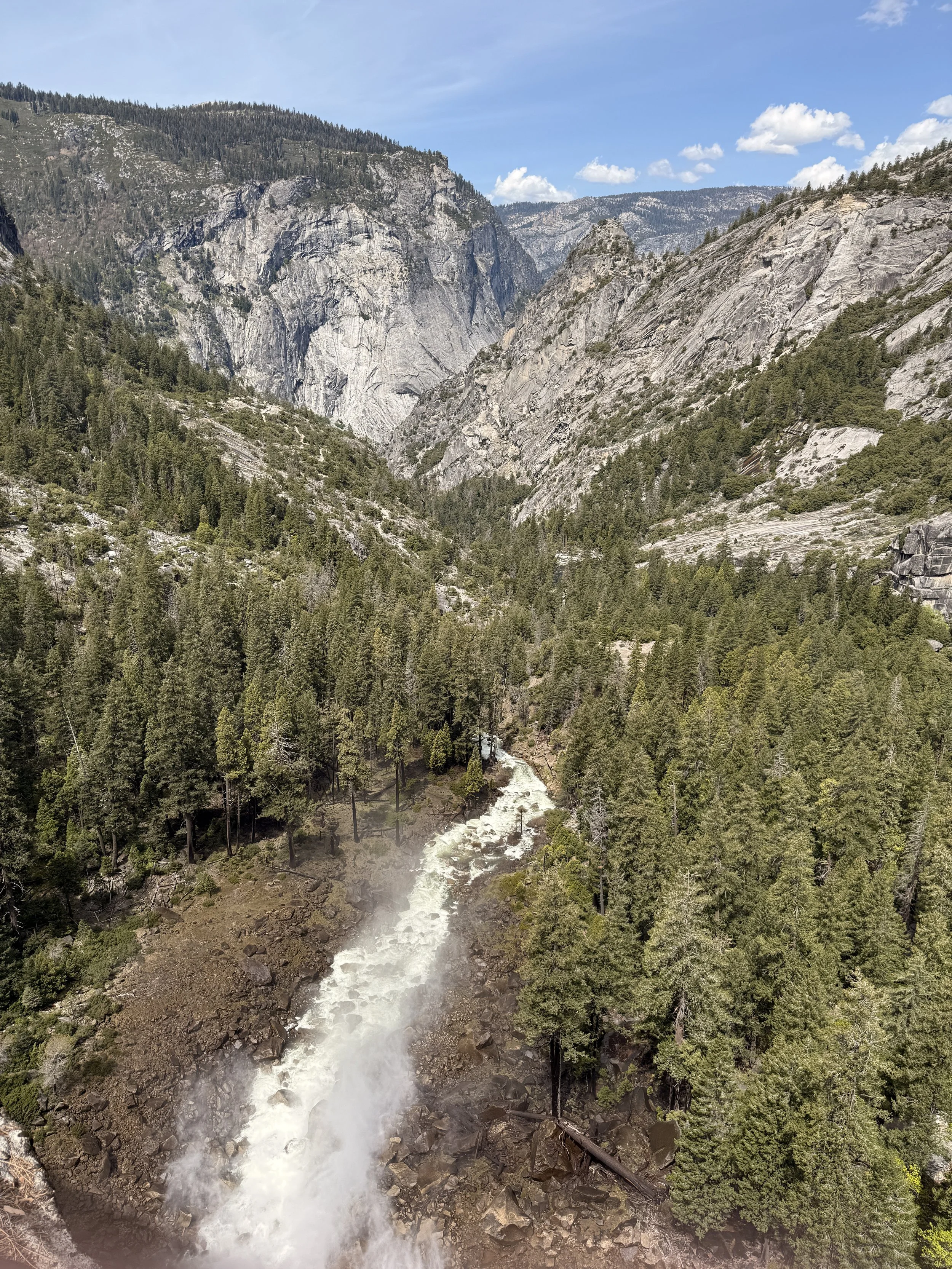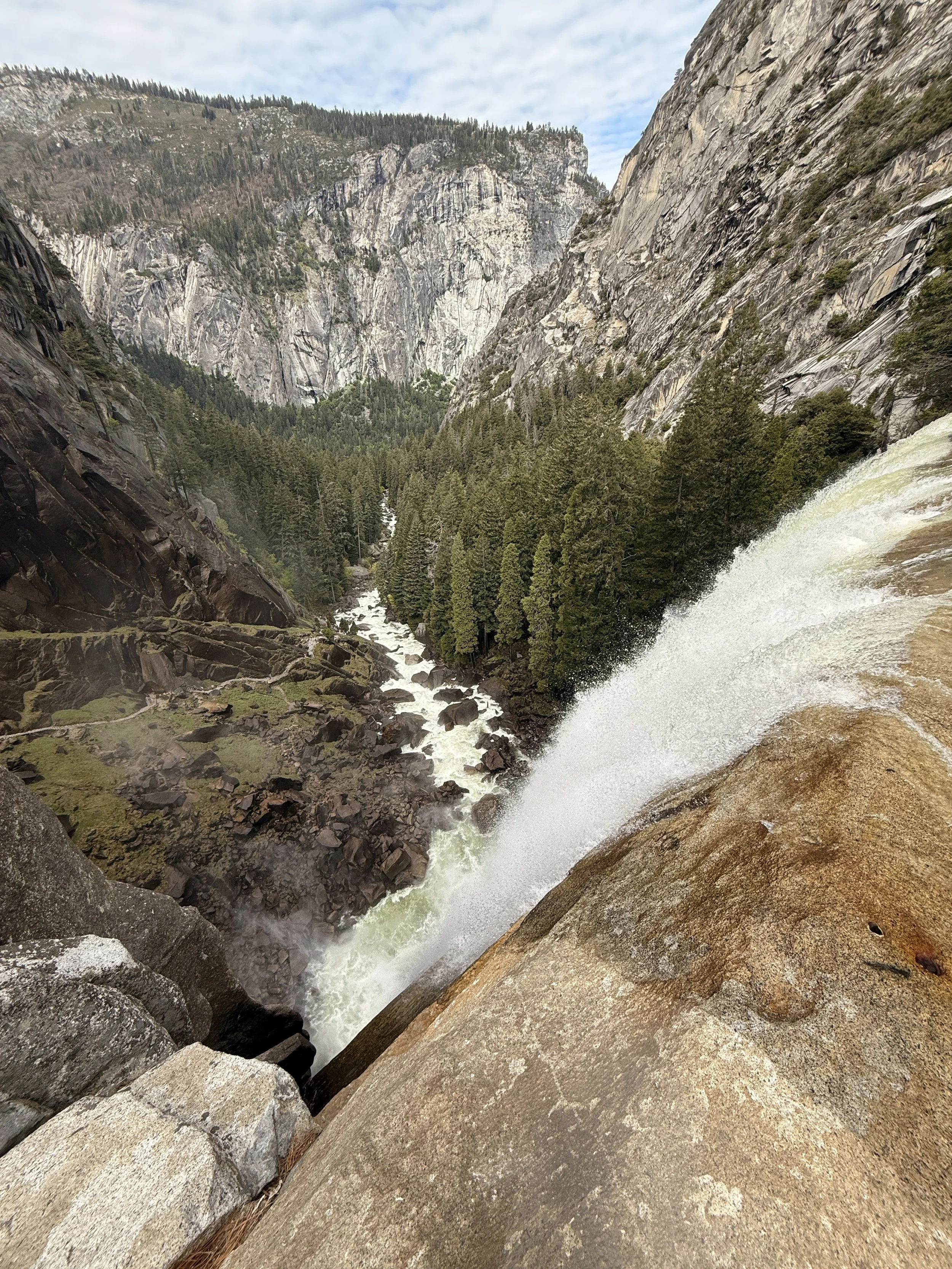 To get to the top of Vernal Falls is 1131ft of elevation gain. Which doesn’t sound terrible, except for the fact you hit that in just over a mile so there is a lot of steep grade parts. About halfway there’s a bridge crossing the river that a lot of people hike to and then turn back, but you should keep going because it’s definitely worth it. Once you get closer to the falls the ground turns into cobblestones that are slick from the mist of the falls. Thankfully there is now a railing but there didn’t used to be until a few years ago. We were there in early May so they water was flowing hard and the mist had us soaked within seconds. The last part of the trail has you climbing stone cut steps, while getting showered with mist. Later on in the day you also have to deal with people coming back down as you go up. Thankfully we were there earlier enough that that wasn’t happening yet because I cannot imagine having to try and pass people. Once you make it to the top you are on a flat triangle that juts out to the top of the waterfall and you get amazing sweeping views into the canyon below. From here you can turn around and go back to finish the Vernal Falls trail, and we had initially thought we would do that, until we went up the stairs and realized that to go back we’d have to go down them again. So even though it meant doubling our elevation gain, we continued on to Nevada Falls.