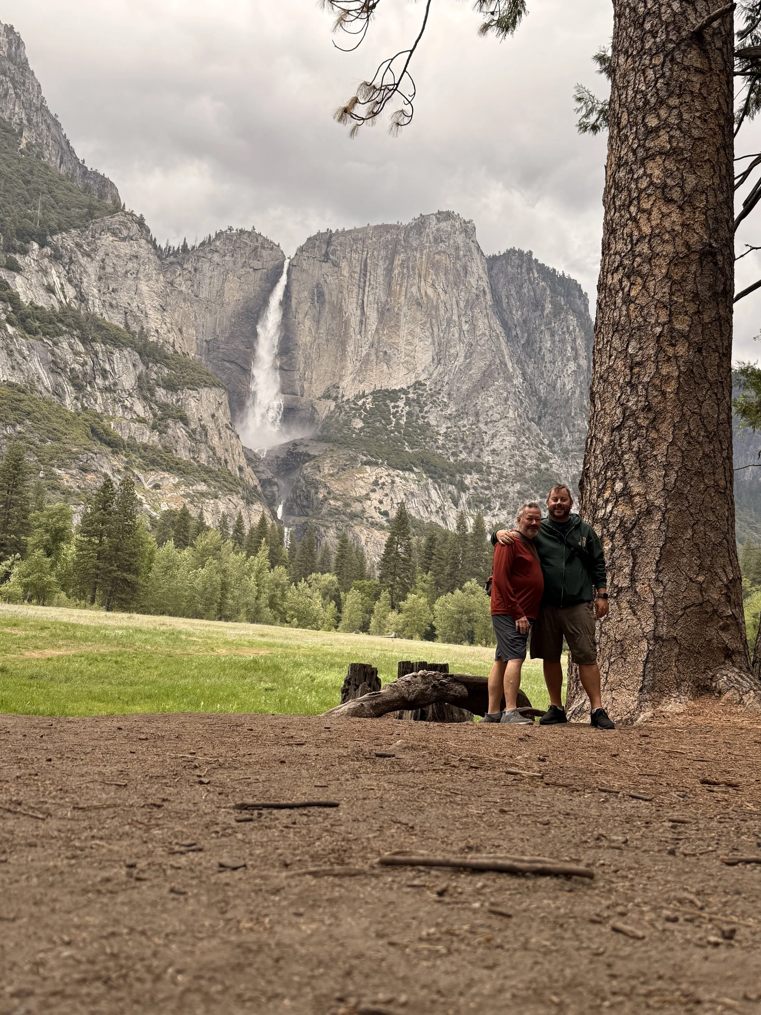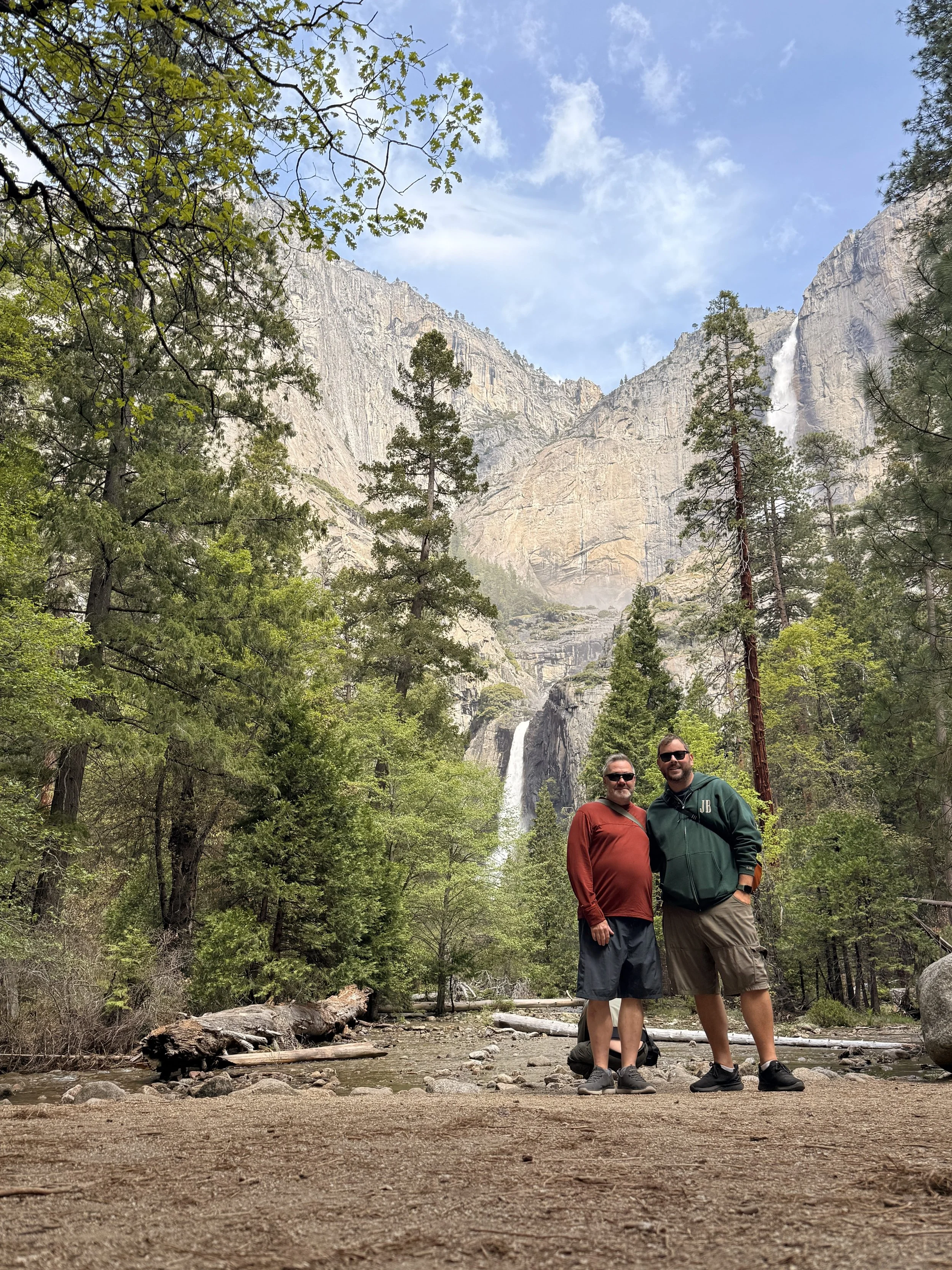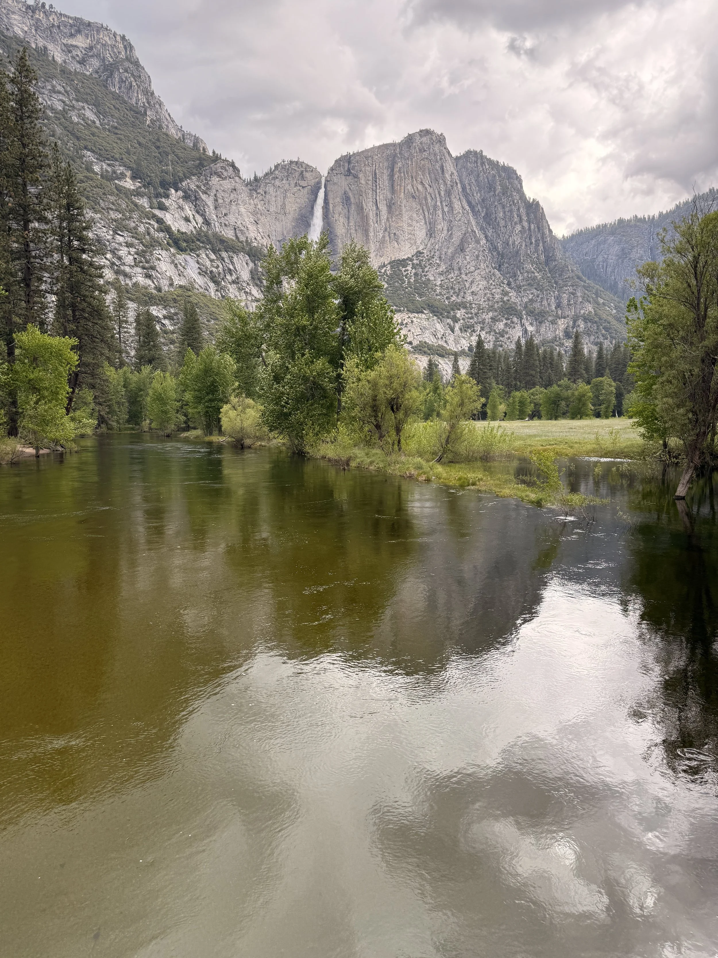 We started with the short hike to the viewpoint for Bridalveil Falls which is the falls that does the famous “Firefall” earlier in the year. It was cool to see it flowing so hard compared to the last time we were here. After hiking back to the bikes we continued on to Cathedral Beach picnic area where we had stopped before and got a photo of the three of us. We were planning to recreate it but the water was much higher this time and the beach barely existed! Whomp whomp. Our next stop was Swinging Bridge which offers great views across the valley to Lower and Upper Yosemite Falls.